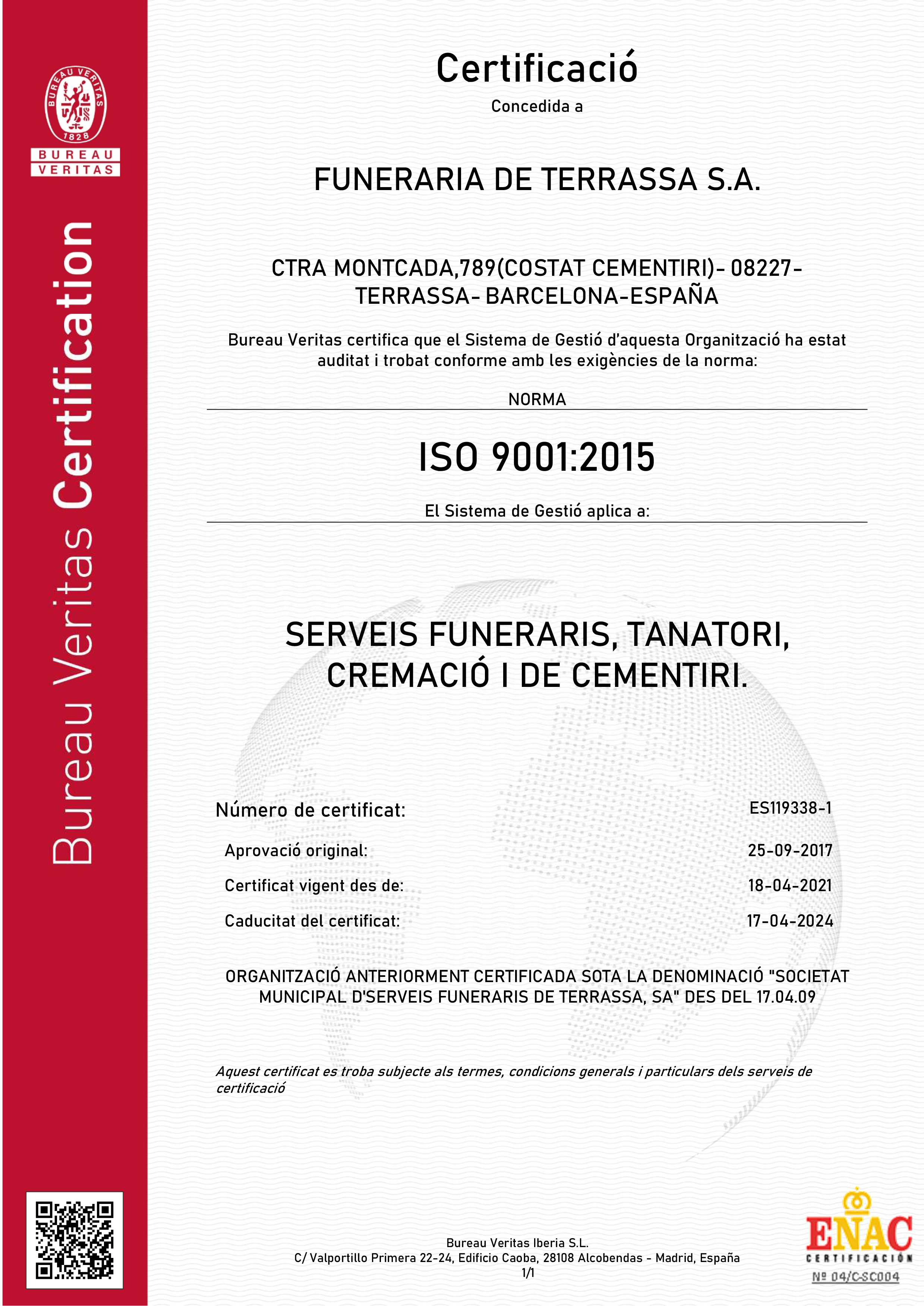 Funerària tiene certificado su Sistema de Gestión de la Calidad según la norma UNE-EN ISO 9001:2015 desde el año 2006.